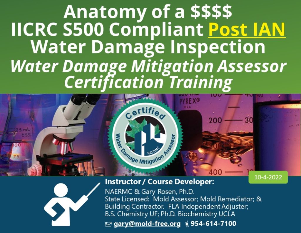 The training is designed for Florida attorneys, adjusters, mold assessors and mold remediators. But the focus is Mold Assessors that want to become NAERMC certified as a Water Damage Mitigation Assessor.